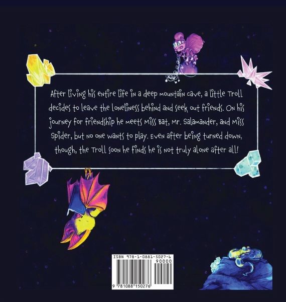 After living his entire life in a deep mountain cave, a little Troll decides to leave the loneliness behind and seek out friends. On his journey for friendship he meets Miss Bat, Mr. Salamander, and Miss Spider, but no one wants to play. Even after being turned down, though, the Troll soon finds he is not truly alone after all!