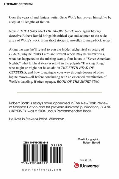 Over the years sf and fantasy writer Gene Wolfe has proven himself to be adept at all lengths of fiction. Now in THE LONG AND THE SHORT OF IT, once again literary detective Robert Borski brings his critical eye and acumen to the wide array of Wolfe's work, from short stories to novellas to mega-book series. Along the way he'll reveal to you the hidden alchemical structure of PEACE, why he thinks Latro and several others may be werewolves, what has happened to the missing twenty-four hours in 'Seven American Nights," what Biblical story is retold in the pulpish 'Tracking Song," who might or might not be an abo in THE FIFTH HEAD OF CERBERUS, and how to navigate your way through dozens of other lupine mazes-all before concluding with an extended examination of Wolfe's dazzling, if often opaque, BOOK OF THE SHORT SUN.