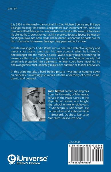 It is 1954 in Montreal-the original Sin City. Michael Spence and Philippe Belanger are long-time friends and partners in an investment firm. When it is discovered that Belanger has embezzled one hundred thousand dollars from his clients, the Crown attorney has him arrested. Because Spence believes an auditing mistake has been made and his friend is innocent, he posts bail for him. Hours after his release, Belanger disappears without a trace. Private investigator Eddie Wade runs a one-man detective agency and needs a hot case to jump-start his bank account. When he is hired to find Belanger and the money he stole, Wade eagerly begins searching for answers within the glitz and glamour of high-class Montreal society. But when he is propelled into a darkness he never could have imagined, he finds a nightmare that ultimately makes him question all that he believes in. In this gripping tale, a hard-boiled private investigator hunting down an embezzler unwittingly stumbles into the underbelly of death, crime, deceit, and betrayal.