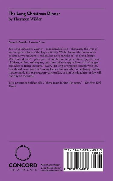 The Long Christmas Dinner - nine decades long - showcases the lives of several generations of the Bayard family. Wilder breaks the boundaries of time as we measure it, and invites us to partake of "one long, happy Christmas dinner" - past, present and future. As generations appear, have children, wither, and depart, only the audience appreciates what changes and what remains the same. "Every last twig is wrapped around with ice. You almost never see that," young Genevieve marvels, not realizing that her mother made this observation years earlier, or that her daughter-in-law will one day do the same.