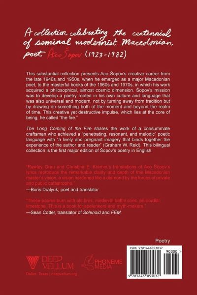 "A collection celebrating the Centennial of seminal modernist Macedonian poet Aco ésopov. This substantive collection represents éSopov's creative career, starting with his first book of poetry in 1944, when he was fighting in the Yugoslav resistance to the German occupation. In the early 1950s, he published two collections that signaled a new direction for Macedonian poetry as a whole, announcing the arrival of new form "intimate lyricism". Over the next 25 years, éSopov's work deepened further, acquiring a philosophical cosmic dimension and at times venturing into surrealism. The Long Coming of the Fire shares the work of a consummate craftsman little-known in the Anglophone world, achieving a "penetrating, resonant, and melodic" poetic language with "a lively and pregnant imagery that binds together the experience of the author and reader" (Graham W. Reid)"--