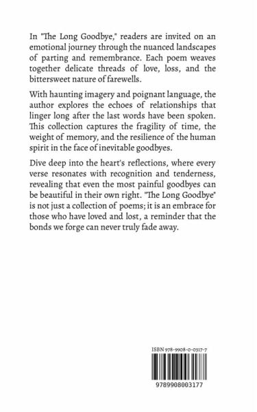 In "The Long Goodbye," readers are invited on an emotional journey through the nuanced landscapes of parting and remembrance. Each poem weaves together delicate threads of love, loss, and the bittersweet nature of farewells. With haunting imagery and poignant language, the author explores the echoes of relationships that linger long after the last words have been spoken. This collection captures the fragility of time, the weight of memory, and the resilience of the human spirit in the face of inevitable goodbyes. Dive deep into the heart's reflections, where every verse resonates with recognition and tenderness, revealing that even the most painful goodbyes can be beautiful in their own right. "The Long Goodbye" is not just a collection of poems; it is an embrace for those who have loved and lost, a reminder that the bonds we forge can never truly fade away.