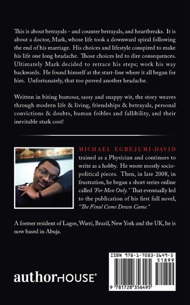 This is about betrayals - and counter betrayals, and heartbreaks. It is about a doctor, Mark, whose life took a downward spiral following the end of his marriage. His choices and lifestyle conspired to make his life one long headache. Those choices led to dire consequences. Ultimately Mark decided to retrace his steps; work his way backwards. He found himself at the start-line where it all began for him. Unfortunately, that too proved another headache. Written in biting humour, sassy and snappy wit, the story weaves through modern life & living, friendships & betrayals, personal convictions & doubts, human foibles and fallibility, and their inevitable stark cost!