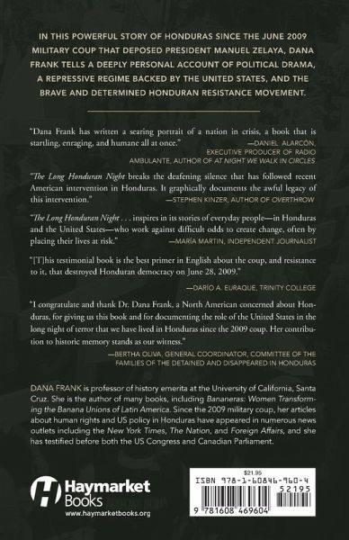 Dana Frank is a professor of history at the University of California, Santa Cruz. She is the author of Buy American: The Untold Story of Economic Nationalism (Beacon, 1999); Purchasing Power: Consumer Organizing, Gender, and the Seattle Labor Movement, 1919–1929 (Cambridge, 1994); Local Girl Makes History: Exploring Northern California's Kitsch Monuments (City Lights, 2007) and, with Howard Zinn and Robin D.G. Kelley, Three Strikes: Miners, Musicians, Salesgirls and the Fighting Spirit of Labor's Last Century (Beacon, 2001). Her contribution to Three Strikes has been reprinted, with a new introduction, by Haymarket Books as Women Strikers Occupy Chain Story, Win Big (2012). Long active in labor solidarity work, since 2000 she has worked with the US Labor Education in the Americas Project (US/LEAP) in support of the banana unions in Latin America. Since the 2009 military coup her articles about human rights and U.S. policy in Honduras have appeared in The Nation, New York Times, Politico Magazine, Foreign Affairs.com, The Baffler, Los Angeles Times, Miami Herald, and many other publications, and she has testified in both the U.S. Congress and Canadian Parliament.