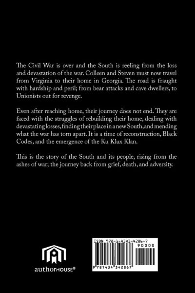 The Civil War is over and the South is reeling from the loss and devastation of the war. Colleen and Steven must now travel from Virginia to their home in Georgia. The road is fraught with hardship and peril; from bear attacks and cave dwellers, to Unionists out for revenge. Even after reaching home, their journey does not end. They are faced with the struggles of rebuilding their home, dealing with devastating losses, finding their place in a new South, and mending what the war has torn apart. It is a time of reconstruction, Black Codes, and the emergence of the Ku Klux Klan. This is the story of the South and its people, rising from the ashes of war; the journey back from grief, death, and adversity.
