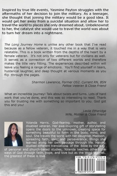 Inspired by true life events, Yasmine Payton struggles with the aftermath of her decision to join the military. As a teenager, she thought that joining the military would be a good idea. It would get her away from a suicidal situation and allow her to travel the world to places she only dreamed about. Unbeknownst to her, the catalyst she would use to travel the world was about to turn her dream into a nightmare. From almost being killed in the line of duty, to an attempted rape on the ship, followed by an event that would result in threats to her life, Payton had to endure things females her age should never have to endure but nothing could prepare her for what those events would ultimately do to her mentally, spiritually and emotionally. PTSD in the military is very real and not knowing how to deal with these emotions would leave Payton in a state of utter despair. Would she go through with killing herself or would she allow her emotions to force her to kill someone else? There's only one way to find out and that's by following Payton on The Long Journey Home.