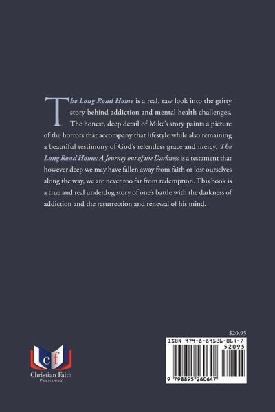 The Long Road Home is a real, raw look into the gritty story behind addiction and mental health challenges. The honest, deep detail of Mike's story paints a picture of the horrors that accompany that lifestyle while also remaining a beautiful testimony of God's relentless grace and mercy. The Long Road Home: A Journey out of the Darkness is a testament that however deep we may have fallen away from faith or lost ourselves along the way, we are never too far from redemption. This book is a true and real underdog story of one's battle with the darkness of addiction and the resurrection and renewal of his mind.