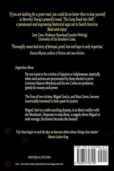 Historical fiction saga set in Argentina. Argentina 1800s No one wants to be a victim of injustice or helplessness, especially when such actions are perpetuated by those elected to serve. Governor Ramon Mendoza and his son Carlos are predators, greedy for money and power. The lives of two victims, Miguel Garcia, and Rosa Caron, become inextricably entwined in their quest for justice. Miguel, heir to a cattle ranching dynasty, is in direct conflict with the Mendoza's. Desperate to stop them, a tragedy drives Miguel to seek revenge; the hunter becomes the hunted! 'If you are looking for a great read, you could do no better than to lose yourself in Beverley Young's powerful novel, 'The Long Road into Hell': a passionate and engrossing historical saga set in South America. Read and enjoy! - Gary Crew, Professor Emeritus(Creative Writing) University of the Sunshine Coast. 'Thoroughly researched story of betrayal, greed, love and hope in early Argentina.' - Donna Munro, author of fiction and non-fiction. 'Our lives begin to end the day we become silent about things that matter' - Martin Luther King