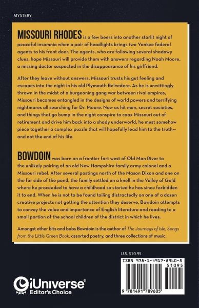 Missouri Rhodes is a few beers into another starlit night of peaceful insomnia when a pair of headlights brings two Yankee federal agents to his front door. The agents, who are following several shadowy clues, hope Missouri will provide them with answers regarding Noah Moore, a missing doctor suspected in the disappearance of his girlfriend. After they leave without answers, Missouri trusts his gut feeling and escapes into the night in his old Plymouth Belvedere. As he is unwittingly thrown in the midst of a burgeoning gang war between rival empires, Missouri becomes entangled in the designs of world powers and terrifying nightmares all searching for Dr. Moore. Now as hit men, secret societies, and things that go bump in the night conspire to coax Missouri out of retirement and drive him back into a shady underworld, he must somehow piece together a complex puzzle that will hopefully lead him to the truth-and not the end of his life.