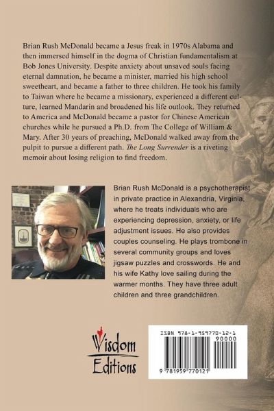 Brian Rush McDonald became a Jesus freak in the 70s in Alabama and then immersed himself in the dogma of Christian fundamentalism at Bob Jones University. Even though he felt anxious about unsaved souls facing eternal damnation, he became a youth and music minister, married his high school sweetheart, and became a father to three children. He took his family to Taiwan where he became a missionary, experienced a different culture, learned Mandarin and broadened his life outlook. They returned to America and McDonald became a pastor for Chinese American churches while he pursued a Ph.D. from The College of William & Mary. After 30 years of preaching, McDonald walked away from the pulpit to pursue a different path. THE LONG SURRENDER is a riveting memoir about losing religion to find freedom.