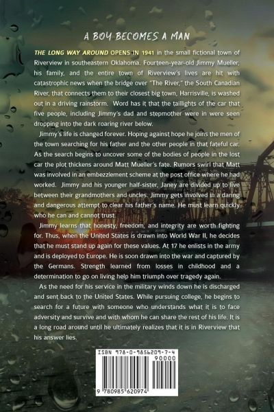 The Long Way Around begins in a fictional small, rural Oklahoma town, based upon the author's hometown of Calvin, Oklahoma in the fall of 1941. Similar to the author's own life, the protagonist, fourteen-year-old Jimmy Mueller's life is changed forever on Halloween of 1941 when his father and stepmother are among the five victims of a car that was swept away into "The River" when a bridge washed out. From there, the book weaves a story of a young teenage boy coming of age who experiences the advantages and disadvantages of small town living with people who face their own conflicts and victories. Characters in the story are reminiscent to wholly inspired by people in the author's life. Jimmy must deal with the mystery surrounding accusations of embezzlement against his father. He takes a daring part in solving the crime leading to justice being rendered à la small town, USA. The story transitions as Jimmy moves to Texas to live with other family members and seek broader educational and life experiences until he ends up enlisting in the army in World War II and being shipped to Germany. From being captured as a POW to being liberated and involved in post-war reconstruction efforts, Jim faces many life lessons and experiences love and loss again as he slowly makes his way into adulthood and the appreciation of who and what makes life worth living.