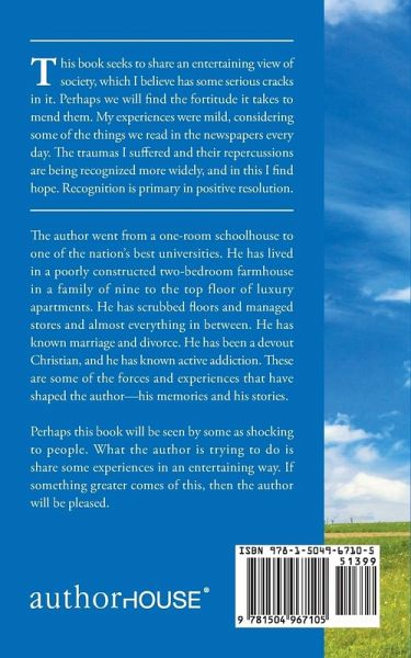 This book seeks to share an entertaining view of society, which I believe has some serious cracks in it. Perhaps we will find the fortitude it takes to mend them. My experiences were mild, considering some of the things we read in the newspapers every day. The traumas I suffered and their repercussions are being recognized more widely, and in this I find hope. Recognition is primary in positive resolution.