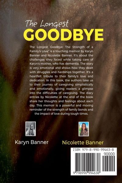 The Longest Goodbye: The Strength of a Family's Love" is a heart-wrenching memoir by Karyn Banner and Nicolette Banner, a mother-daughter duo facing the challenges of caregiving for Karyn's mother, who is battling dementia. This poignant tale dives into the emotional rollercoaster of their journey, filled with struggles, hardships, and strength. With a raw and honest narrative, Karyn and Nicolette share their profound experiences, showcasing a family's love and dedication. Told with simplicity and deep emotion, the book offers a glimpse into the hardship of caregiving and a touching tribute to Karyn's mother. Readers are also introduced to Nicolette's diary, capturing each day's events, emotions, and reflections in her heartfelt words. "The Longest Goodbye" is a powerful and moving account of family bonds, resilience, and the profound impact of love in the face of adversity.