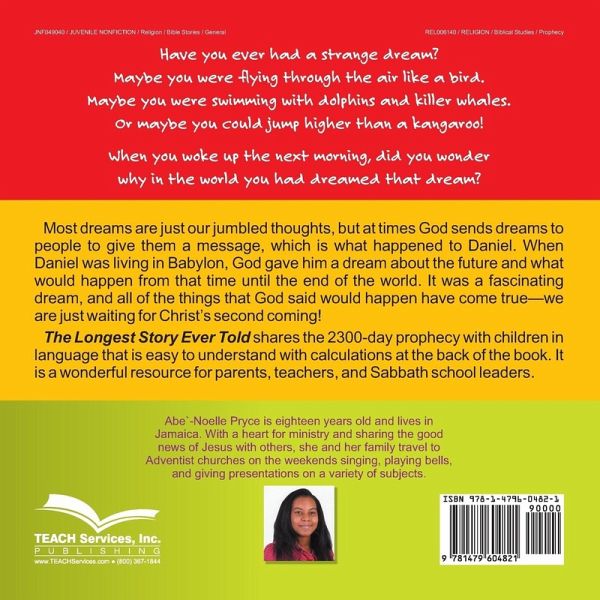 Have you ever had a strange dream? Maybe you were flying through the air like a bird. Maybe you were swimming with dolphins and killer whales. Or maybe you could jump higher than a kangaroo! When you woke up the next morning, did you wonder why in the world you had dreamed that dream? Most dreams are just our jumbled thoughts, but at times God sends dreams to people to give them a message, which is what happened to Daniel. When Daniel was living in Babylon, God gave him a dream about the future and what would happen from that time until the end of the world. It was a fascinating dream, and all of the things that God said would happen have come true-we are just waiting for Christ's second coming! "The Longest Story Ever Told" shares the 2300-day prophecy with children in language that is easy to understand with calculations at the back of the book. It is a wonderful resource for parents, teachers, and Sabbath school leaders.