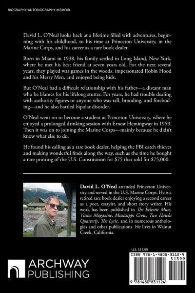 David L. O'Neal looks back at a lifetime filled with adventures, beginning with his childhood, to his time at Princeton University, in the Marine Corps, and his career as a rare book dealer. Born in Miami in 1938, his family settled in Long Island, New York, where he met his best friend at seven years old. For the next several years, they played war games in the woods, impersonated Robin Hood and his Merry Men, and enjoyed being kids. But O'Neal had a difficult relationship with his father--a distant man who he blames for his lifelong stutter. For years, he had trouble dealing with authority figures or anyone who was tall, brooding, and foreboding--and he also battled bipolar disorder. O'Neal went on to become a student at Princeton University, where he enjoyed a prolonged drinking session with Ernest Hemingway in 1959. Then it was on to joining the Marine Corps--mainly because he didn't know what else to do. He found his calling as a rare book dealer, helping the FBI catch thieves and making wonderful finds along the way, such as the time he bought a rare printing of the U.S. Constitution for $75 that sold for $75,000.