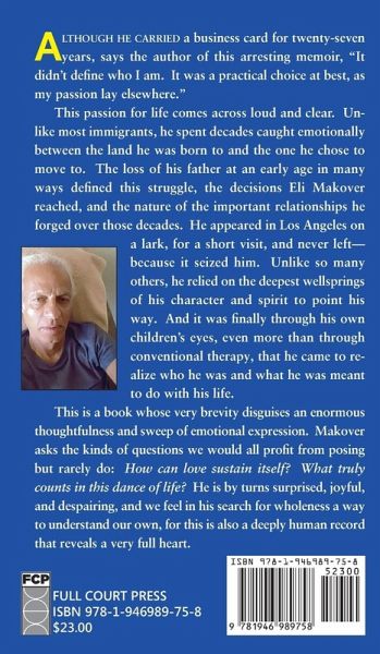 Although he carried a business card for twenty-seven years, says the author of this arresting memoir, "It didn’t define who I am. It was a practical choice at best, as my passion lay elsewhere." This passion for life comes across loud and clear. Unlike most immigrants, he spent decades caught emotionally between the land he was born to and the one he chose to move to. The loss of his father at an early age in many ways defined this struggle, the decisions Eli Makover reached, and the nature of the important relationships he forged over those decades. He appeared in Los Angeles on a lark, for a short visit, and never left—because it seized him. Unlike so many others, he relied on the deepest wellsprings of his character and spirit to point his way. And it was finally through his own children’s eyes, even more than through conventional therapy, that he came to realize who he was and what he was meant to do with his life. This is a book whose very brevity disguises an enormous thoughtfulness and sweep of emotional expression. Makover asks the kinds of questions we would all profit from posing but rarely do: How can love sustain itself? What truly counts in this dance of life? He is by turns surprised, joyful, and despairing, and we feel in his search for wholeness a way to understand our own, for this is also a deeply human record that reveals a very full heart.