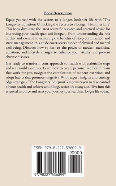Equip yourself with the secrets to a longer, healthier life with "The Longevity Equation: Unlocking the Secrets to a Longer, Healthier Life" This book dives into the latest scientific research and practical advice for improving your health span and lifespan. From understanding the role of diet and exercise to exploring the benefits of sleep optimization and stress management, this guide covers every aspect of physical and mental well-being. Discover how to harness the power of modern medicine, nutrition, and lifestyle changes to enhance your vitality and prevent chronic diseases. Get ready to transform your approach to health with actionable steps and real-world examples. Learn how to create personalized health plans that work for you, navigate the complexities of modern nutrition, and adopt habits that promote longevity. With expert insights and cutting-edge strategies, "The Longevity Blueprint" empowers you to take control of your health and achieve a fulfilling, active life at any age. Dive into this essential resource and start your journey to a healthier, longer life today.