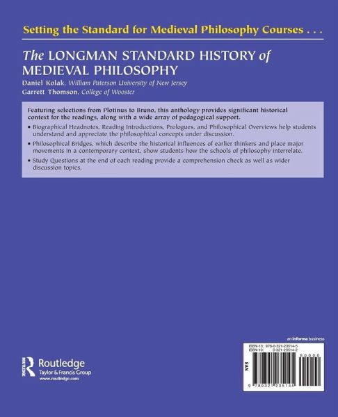 Preface. General Introduction. I. EARLY MEDIEVAL PHILOSOPHY. 1. Plotinus: A Biographical History. 2. Boethius: A Biographical History. 3. John Scotus Eriugena: A Biographical History. 4. Abelard: A Biographical History. 5. Hildegard of Bingen: A Biographical History. 6. John of Salisbury: A Biographical History. II. CHRISTIAN PHILOSOPHY. 7. Augustine: A Biographical History. 8. Anselm: A Biographical History. 9. Aquinas: A Biographical History. III. ISLAMIC AND JEWISH PHILOSOPHY. 10. Avicenna (Ibn Sina): A Biographical History. 11. Al-Ghazali: A Biographical History. 12. Averroes: A Biographical History. 13. Maimonides (Moses Ben Maimon): A Biographical History. IV. LATE MEDIEVAL PHILOSOPHY. 14. Roger Bacon: A Biographical History. 15. Bonaventure: Philosophical Overview. 16. John Duns Scotus: A Biographical History. 17. Ockham: A Biographical History. 18. Meister Eckhart: A Biographical History. 19. Catherine of Siena: A Biographical History. 20. Nicholas of Cusa: A Biographical History. 21. Giordano Bruno: A Biographical History.