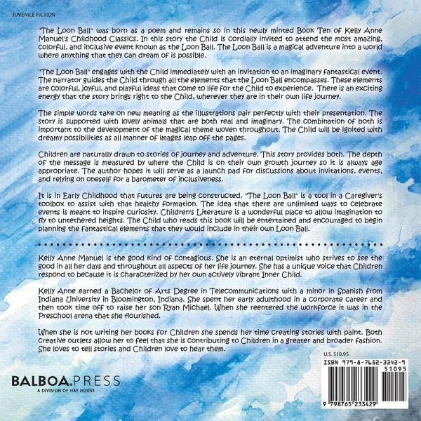 "The Loon Ball" was born as a poem and remains so in this newly minted Book Ten of Kelly Anne Manuel's Childhood Classics. In this story the Child is cordially invited to attend the most amazing, colorful, and inclusive event known as the Loon Ball. The Loon Ball is a magical adventure into a world where anything that they can dream of is possible. "The Loon Ball" engages with the Child immediately with an invitation to an imaginary fantastical event. The narrator guides the Child through all the elements that the Loon Ball encompasses. These elements are colorful, joyful, and playful ideas that come to life for the Child to experience. There is an exciting energy that the story brings right to the Child, wherever they are in their own life journey. The simple words take on new meaning as the illustrations pair perfectly with their presentation. The story is supported with lovely animals that are both real and imaginary. The combination of both is important to the development of the magical theme woven throughout. The Child will be ignited with dreamy possibilities as all manner of images leap off the pages. Children are naturally drawn to stories of journey and adventure. This story provides both. The depth of the message is measured by where the Child is on their own growth journey so it is always age appropriate. The author hopes it will serve as a launch pad for discussions about invitations, events, and relying on oneself for a barometer of inclusiveness. It is in Early Childhood that futures are being constructed. "The Loon Ball" is a tool in a Caregiver's toolbox to assist with that healthy formation. The idea that there are unlimited ways to celebrate events is meant to inspire curiosity. Children's Literature is a wonderful place to allow imagination to fly to untethered heights. The Child who reads this book will be entertained and encouraged to begin planning the fantastical elements that they would include in their own Loon Ball.