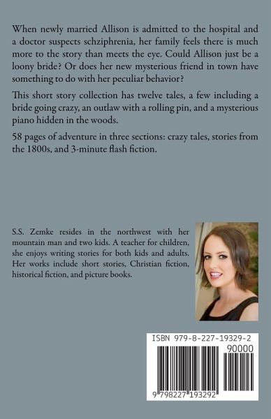 When newly married Allison is admitted to the hospital and a doctor suspects schziphrenia, her family feels there is much more to the story than meets the eye. Could Allison just be a loony bride? Or does her new mysterious friend in town have something to do with her peculiar behavior? This short story collection has twelve tales. A few include a bride going crazy, an outlaw with a rolling pin, and a mysterious piano hidden in the woods. 66 pages of adventure in three sections: crazy tales, stories from the 1800s, 3-minute flash fiction.
