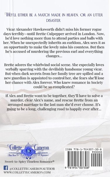 They'll either be a match made in heaven, or an utter disaster... Vicar Alexander Hawksworth didn't miss his former rogue days terribly-until Brette Culpepper arrived in London. Now, he'd love nothing more than to attend parties and balls with her. When he unexpectedly inherits an earldom, Alex sees it as an opportunity to make the lovely miss his countess. But then he's accused of murdering the previous earl and everything changes... Brette adores the whirlwind social scene. She especially loves verbally sparring with the devilishly handsome young vicar. But when dark secrets from her family tree are spilled and a new guardian is appointed to control her, she fears she'll lose her chance with Alex forever. Who knew romance in Society could be so complicated? If Alex and Brette want to be together, they'll have to solve a murder, clear Alex's name, and rescue Brette from an arranged marriage to the last man she'd ever choose. It's going to be a long, challenging road to happily ever after... Buy the third book of The Culpepper Misses historical series for a romping, emotional, and romantic adventure you won't want to put down. Though this book is part of a series, it can easily be read as a stand-alone THE CULPEPPER MISSES SERIESThe Earl and the Spinster The Marquis and the Vixen The Lord and the Wallflower The Buccaneer and the Bluestocking The Lieutenant and the Lady CHECK OUT USA TODAY BESTSELLING AUTHOR, COLLETTE CAMERON'S COMPLETE LIBRARY OF REGENCY AND SCOTTISH HIGHLANDER ROMANCE SERIES: · Chronicles of the Westbrook Brides · Daughters of Desire: Scandalous Ladies · For the Love of an Earl (Wicked Earls' Club) · Heart of a Scot · Highland Heather Romancing a Scot: Castle Brides · Ladies of Opportunity · Seductive Scoundrels · The Culpepper Misses · The Honorable Rogues® This book may contain adult content and language.