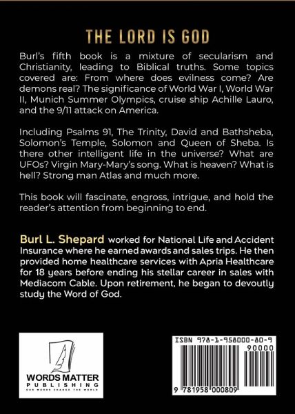 Burl's fifth book is a mixture of secularism and Christianity, leading to Biblical truths. Some topics covered are: From where does evilness come? Are demons real? The significance of World War I, World War II, Munich Summer Olympics, cruise ship Achille Lauro, and the 9/11 attack on America. Including Psalms 91, The Trinity, David and Bathsheba, Solomon's Temple, Solomon and Queen of Sheba. Is there other intelligent life in the universe? What are UFOs? Virgin Mary-Mary's song. What is heaven? What is hell? Strong man Atlas and much more.This book will fascinate, engross, intrigue, and hold the reader's attention from beginning to end.