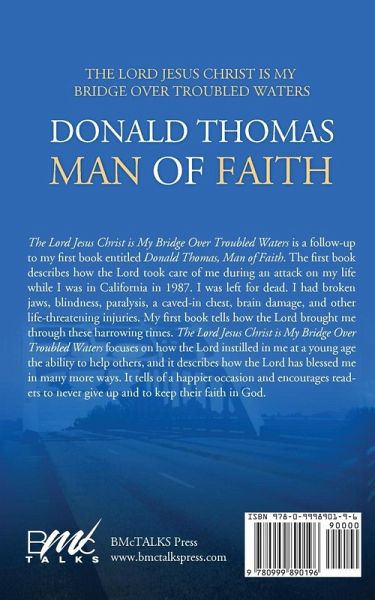 The Lord Jesus Christ is My Bridge Over Troubled Waters is a follow-up to my first book entitled Donald Thomas, Man of Faith. The first book describes how the Lord took care of me during an attack on my life while I was in California in 1987. I was left for dead. I had broken jaws, blindness, paralysis, a caved-in chest, brain damage, and other life-threatening injuries. My first book tells how the Lord brought me through these harrowing times. The Lord Jesus Christ is My Bridge Over Troubled Waters focuses on how the Lord instilled in me at a young age the ability to help others, and it describes how the Lord has blessed me in many more ways. It tells of a happier occasion and encourages readers to never give up and to keep their faith in God.