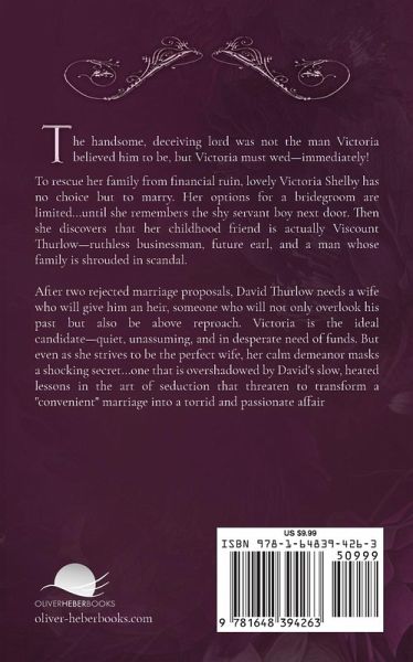 The handsome, deceiving lord was not the man Victoria believed him to be, but Victoria must wed-immediately! To rescue her family from financial ruin, lovely Victoria Shelby has no choice but to marry. Her options for a bridegroom are limited...until she remembers the shy servant boy next door. Then she discovers that her childhood friend is actually Viscount Thurlow-ruthless businessman, future earl, and a man whose family is shrouded in scandal. After two rejected marriage proposals, David Thurlow needs a wife who will give him an heir, someone who will not only overlook his past but also be above reproach. Victoria is the ideal candidate-quiet, unassuming, and in desperate need of funds. But even as she strives to be the perfect wife, her calm demeanor masks a shocking secret...one that is overshadowed by David's slow, heated lessons in the art of seduction that threaten to transform a "convenient" marriage into a torrid and passionate affair