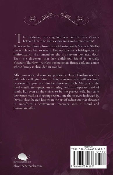 The handsome, deceiving lord was not the man Victoria believed him to be, but Victoria must wed-immediately! To rescue her family from financial ruin, lovely Victoria Shelby has no choice but to marry. Her options for a bridegroom are limited...until she remembers the shy servant boy next door. Then she discovers that her childhood friend is actually Viscount Thurlow-ruthless businessman, future earl, and a man whose family is shrouded in scandal. After two rejected marriage proposals, David Thurlow needs a wife who will give him an heir, someone who will not only overlook his past but also be above reproach. Victoria is the ideal candidate-quiet, unassuming, and in desperate need of funds. But even as she strives to be the perfect wife, her calm demeanor masks a shocking secret...one that is overshadowed by David's slow, heated lessons in the art of seduction that threaten to transform a "convenient" marriage into a torrid and passionate affair.