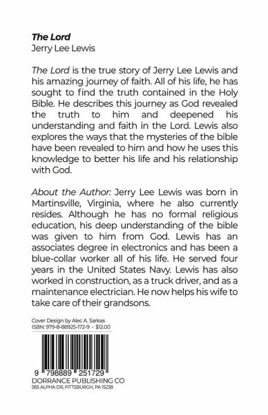 The Lord is the true story of Jerry Lee Lewis and his amazing journey of faith. All of his life, he has sought to find the truth contained in the Holy Bible. He describes this journey as God revealed the truth to him and deepened his understanding and faith in the Lord. Lewis also explores the ways that the mysteries of the bible have been revealed to him and how he uses this knowledge to better his life and his relationship with God. About the Author Jerry Lee Lewis was born in Martinsville, Virginia, where he also currently resides. Although he has no formal religious education, his deep understanding of the bible was given to him from God. Lewis has an associates degree in electronics and has been a blue-collar worker all of his life. He served four years in the United States Navy. Lewis has also worked in construction, as a truck driver, and as a maintenance electrician. He now helps his wife to take care of their grandsons.