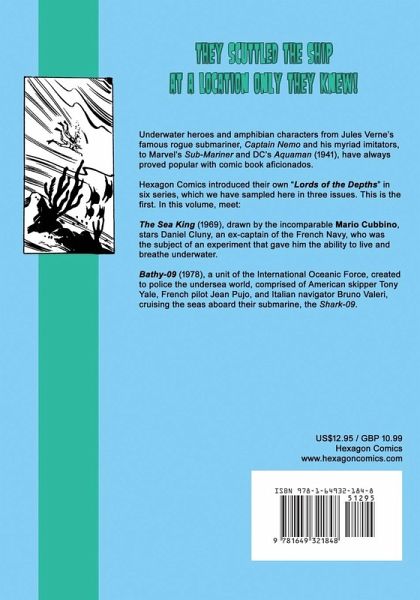 Underwater heroes and amphibian characters from Jules Verne's famous rogue submariner, Captain Nemo and his myriad imitators, to Marvel's Sub-Mariner and DC's Aquaman (1941), have always proved popular with comic book aficionados. Hexagon Comics introduced their own "Lords of the Depths" in six series, which we have sampled here in three issues. This is the first. In this volume, meet: The Sea King (1969), drawn by the incomparable Mario Cubbino, starring. Daniel Cluny, an ex-captain of the French Navy, who was the subject of an experiment that gave him the ability to live and breathe underwater. Bathy-09 (1978), a unit of the International Oceanic Force, created to police the undersea world, comprised of American skipper Tony Yale, French pilot Jean Pujo, and Italian navigator Bruno Valeri, cruising the seas aboard their submarine, the Shark-09.