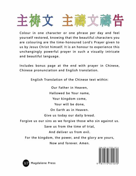 Colour in one character or one phrase per day and feel yourself restored, knowing that the beautiful characters you are colouring are the time-honoured Lord's Prayer given to us by Jesus Christ himself. It is an honour to experience this unchangingly powerful prayer in such a visually intricate and beautiful language. Includes bonus page at the end with prayer in Chinese, Chinese pronunciation and English translation. Product Information: 8.5x11 perfect bound, glossy cover finish, 70 lbs quality interior paper for marker, crayon and color pencil use. English Translation of the Chinese text within: Our Father in Heaven, Hallowed be Your name, Your kingdom come, Your will be done, On Earth as in Heaven. Give us today our daily bread. Forgive us our sins as we forgive those who sin against us. Save us from the time of trial, And deliver us from evil. For the kingdom, the power, and the glory are yours, Now and forever. Amen.