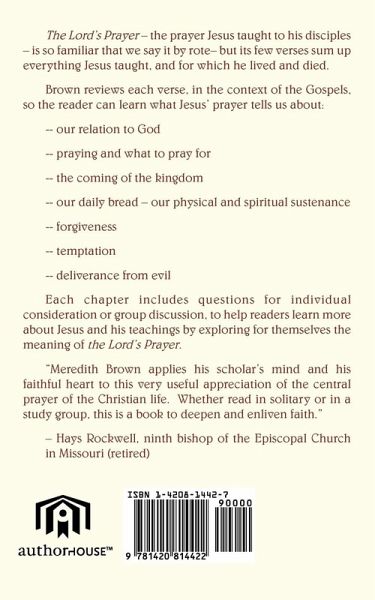 The Lord's Prayer - the prayer Jesus taught to his disciples - is so familiar that we say it by rote- but its few verses sum up everything Jesus taught, and for which he lived and died. Brown reviews each verse, in the context of the Gospels, so the reader can learn what Jesus' prayer tells us about: -- our relation to God -- praying and what to pray for -- the coming of the kingdom -- our daily bread - our physical and spiritual sustenance -- forgiveness -- temptation --deliverance from evil Each chapter includes questions for individual consideration or group discussion, to help readers learn more about Jesus and his teachings by exploring for themselves the meaning of the Lord's Prayer. "Meredith Brown applies his scholar's mind and his faithful heart to this very useful appreciation of the central prayer of the Christian life. Whether read in solitary or in a study group, this is a book to deepen and enliven faith." Hays Rockwell, ninth bishop of the Episcopal Church in Missouri (retired)