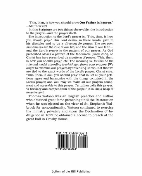 "This, then, is how you should pray: Our Father in heaven." -Matthew 6:9 In this Scripture are two things observable: the introduction to the prayer-and the prayer itself. The introduction to the Lord's prayer is, "This, then, is how you should pray." Our Lord Jesus, in these words, gave to his disciples and to us a directory for prayer. The ten commandments are the rule of our life, and the sum of our faith-and the Lord's prayer is the pattern of our prayer. As God prescribed Moses a pattern of the tabernacle (Exod 25:9), so Christ has here prescribed us a pattern of prayer. "This, then, is how you should pray," etc. The meaning is, let this be the rule and model according to which you frame your prayers. [We ought to examine our prayers by this rule.] Calvin. Not that we are tied to the exact words of the Lord's prayer. Christ says, "This, then, is how you should pray" that is, let all your petitions agree and harmonize with the things contained in the Lord's prayer; and well may we make all our prayers consonant and agreeable to this prayer. Tertullian calls this prayer, "a breviary and compendium of the gospel!" It is like a heap of massive gold. Thomas Watson was an English preacher and author who obtained great fame preaching until the Restoration when he was ejected as the vicar of St. Stephen's Walbrook for noncomformity. Watson continued to exercise his ministry privately and upon the Declaration of Indulgence in 1672 he obtained a license to preach at the great hall in Crosby House.
