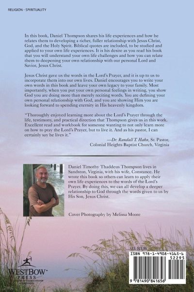 In this book, Daniel Thompson shares his life experiences and how he relates them to developing a richer, fuller relationship with Jesus Christ, God, and the Holy Spirit. Biblical quotes are included, to be studied and applied to your own life experiences. It is his desire as you read his book that you will understand your own life challenges and how you can relate them to deepening your own relationship with our personal Lord and Savior, Jesus Christ. Jesus Christ gave us the words in the Lord's Prayer, and it is up to us to incorporate them into our own lives. Daniel encourages you to write your own words in this book and leave your own legacy to your family. Most importantly, when you put your own personal feelings in writing, you show God you are doing more than merely reciting words. You are defining your own personal relationship with God, and you are showing Him you are looking forward to spending eternity in His heavenly kingdom. "Thoroughly enjoyed learning more about the Lord's Prayer through the life, testimony, and practical direction that Thompson gives us in this work. Excellent read and workbook for someone wanting to not only learn more on how to pray the Lord's Prayer, but to live it. And as his pastor, I can certainly say he lives it." -Dr. Randall T. Hahn, Sr. Pastor, Colonial Heights Baptist Church, Virginia