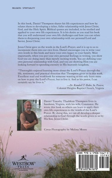 In this book, Daniel Thompson shares his life experiences and how he relates them to developing a richer, fuller relationship with Jesus Christ, God, and the Holy Spirit. Biblical quotes are included, to be studied and applied to your own life experiences. It is his desire as you read his book that you will understand your own life challenges and how you can relate them to deepening your own relationship with our personal Lord and Savior, Jesus Christ. Jesus Christ gave us the words in the Lord's Prayer, and it is up to us to incorporate them into our own lives. Daniel encourages you to write your own words in this book and leave your own legacy to your family. Most importantly, when you put your own personal feelings in writing, you show God you are doing more than merely reciting words. You are defining your own personal relationship with God, and you are showing Him you are looking forward to spending eternity in His heavenly kingdom. "Thoroughly enjoyed learning more about the Lord's Prayer through the life, testimony, and practical direction that Thompson gives us in this work. Excellent read and workbook for someone wanting to not only learn more on how to pray the Lord's Prayer, but to live it. And as his pastor, I can certainly say he lives it." -Dr. Randall T. Hahn, Sr. Pastor, Colonial Heights Baptist Church, Virginia