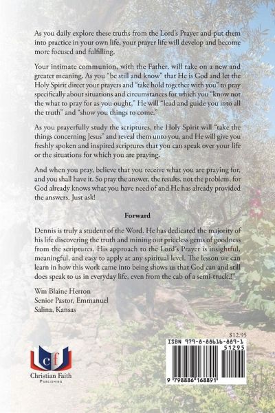 As you daily explore these truths from the Lord's Prayer and put them into practice in your own life, your prayer life will develop and become more focused and fulfilling. Your intimate communion, with the Father, will take on a new and greater meaning. As you "be still and know" that He is God and let the Holy Spirit direct your prayers and "take hold together with you" to pray specifically about situations and circumstances for which you "know not the what to pray for as you ought," He will "lead and guide you into all the truth" and "show you things to come." As you prayerfully study the scriptures, the Holy Spirit will "take the things concerning Jesus" and reveal them unto you, and He will give you freshly spoken and inspired scriptures that you can speak over your life or the situations for which you are praying. And when you pray, believe that you receive what you are praying for, and you shall have it. So pray the answer, the results, not the problem, for God already knows what you have need of and He has already provided the answers. Just ask!