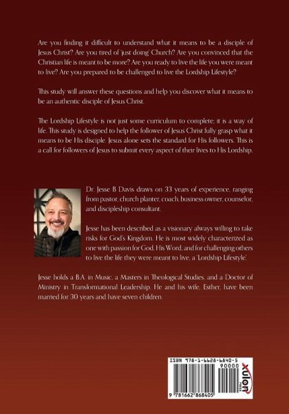 Are you finding it difficult to understand what it means to be a disciple of Jesus Christ? Are you tired of 'just doing' Church? Are you convinced that the Christian life is meant to be more? Are you ready to live the life you were meant to live? Are you prepared to be challenged to live the Lordship Lifestyle? This study will answer these questions and help you discover what it means to be an authentic disciple of Jesus Christ. The Lordship Lifestyle is not just some curriculum to complete; it is a way of life. This study is designed to help the follower of Jesus Christ fully grasp what it means to be His disciple. Jesus alone sets the standard for His followers. This is a call for followers of Jesus to submit every aspect of their lives to His Lordship. Dr. Jesse B Davis draws on 33 years of experience, ranging from pastor, church planter, coach, business owner, counselor, and discipleship consultant. Jesse has been described as a visionary always willing to take risks for God's Kingdom. He is most widely characterized as one with passion for God, His Word, and for challenging others to live the life they were meant to live, a 'Lordship Lifestyle'. Jesse holds a B.A. in Music, a Masters in Theological Studies, and a Doctor of Ministry in Transformational Leadership. He and his wife, Esther, have been married for 30 years and have seven children.