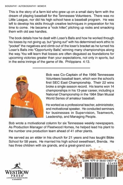 This is the story of a farm kid who grew up on a small dairy farm with the dream of playing baseball for the Tennessee Volunteers. There was no Little League, nor did his high school have a baseball program. He was left to develop his skills through creative techniques in preparation for his time to come. He became a "rock hitter", pitching up rocks and smacking them with old axe handles. The book details how he dealt with Loser's Balls and how he worked through his losses by not giving up, but "giving out" with his determined work ethic to "pocket" the negatives and climb out of the loser's bracket as he turned his Loser's Balls into "Opportunity Balls", winning many championships along the way. You will learn that losses are often disguised as foundations for upcoming victories greater than your expectations, not only in sports, but in the extra innings of the game of life. Philippians 4:13.