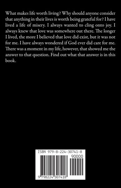 What makes life worth living? Why should anyone consider that anything in their lives is worth being grateful for? I have lived a life of misery. I always wanted to cling onto joy. I always knew that love was somewhere out there. The longer I lived, the more I believed that love did exist, but it was not for me. I have always wondered if God ever did care for me. There was a moment in my life, however, that showed me the answer to that question. Find out what that answer is in this book.