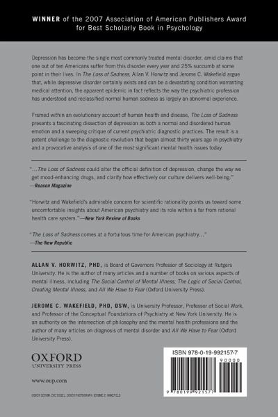 Depression has become the single most commonly treated mental disorder, amid claims that one out of ten Americans suffer from this disorder every year and 25% succumb at some point in their lives. Warnings that depressive disorder is a leading cause of worldwide disability have been accompanied by a massive upsurge in the consumption of antidepressant medication, widespread screening for depression in clinics and schools, and a push to diagnose depression early, on the basis of just a few symptoms, in order to prevent more severe conditions from developing. In The Loss of Sadness, Allan V. Horwitz and Jerome C. Wakefield argue that, while depressive disorder certainly exists and can be a devastating condition warranting medical attention, the apparent epidemic in fact reflects the way the psychiatric profession has understood and reclassified normal human sadness as largely an abnormal experience. With the 1980 publication of the landmark third edition of the Diagnostic and Statistical Manual of Mental Disorders (DSM-III), mental health professionals began diagnosing depression based on symptoms-such as depressed mood, loss of appetite, and fatigue-that lasted for at least two weeks. This system is fundamentally flawed, the authors maintain, because it fails to take into account the context in which the symptoms occur. They stress the importance of distinguishing between abnormal reactions due to internal dysfunction and normal sadness brought on by external circumstances. Under the current DSM classification system, however, this distinction is impossible to make, so the expected emotional distress caused by upsetting events-for example, the loss of a job or the end of a relationship-could lead to a mistaken diagnosis of depressive disorder. Indeed, it is this very mistake that lies at the root of the presumed epidemic of major depression in our midst. In telling the story behind this phenomenon, the authors draw on the 2,500-year history of writing about depression, including studies in both the medical and social sciences, to demonstrate why the DSM's diagnosis is so flawed. They also explore why it has achieved almost unshakable currency despite its limitations. Framed within an evolutionary account of human health and disease, The Loss of Sadness presents a fascinating dissection of depression as both a normal and disordered human emotion and a sweeping critique of current psychiatric diagnostic practices. The result is a potent challenge to the diagnostic revolution that began almost thirty years ago in psychiatry and a provocative analysis of one of the most significant mental health issues today.