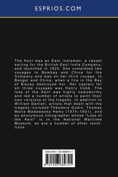 The Kent was an East Indiaman, a vessel sailing for the British East India Company, and launched in 1820. She completed two voyages to Bombay and China for the Company and was on her third voyage, to Bengal and China, when a fire in the Bay of Biscay destroyed her. Her captain for all three voyages was Henry Cobb. The loss of the Kent was highly newsworthy and led a number of artists to paint their own versions of the tragedy. In addition to William Daniell, artists that dealt with the tragedy included Théodore Gudin, Thomas Marie Madawaska Hemy (1874-1931), and an anonymous lithographer whose "Loss of the Kent" is in the National Maritime Museum, as are a number of other renditions.