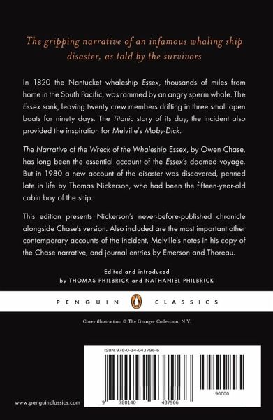 In 1820, the Nantucket whaleship Essex was rammed by an angry sperm whale thousands of miles from home in the South Pacific. The Essex sank, leaving twenty crew members drifting in three small open boats for ninety days. Through drastic measures, eight men survived to reveal this astonishing tale. The Narrative of the Wreck of the Whaleship Essex, by Owen Chase, has long been the essential account of the Essex s doomed voyage. But in 1980, a new account of the disaster was discovered, penned late in life by Thomas Nickerson, who had been the fifteen-year-old cabin boy of the ship. This discovery has vastly expanded and clarified the history of an event as grandiose in its time as the Titanic.