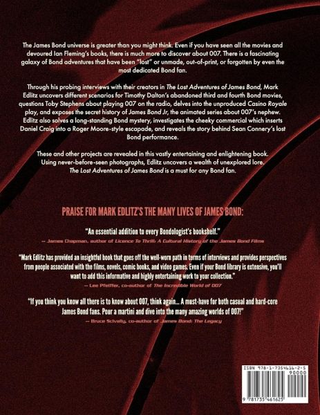 The James Bond universe is greater than you might think. Even if you have seen all the movies and devoured Ian Fleming's books, there is much more to discover about 007. There is a fascinating galaxy of Bond adventures that have been "lost" or unmade, out-of-print, or forgotten by even the most dedicated Bond fan. Through his probing interviews with their creators in The Lost Adventures of James Bond, Mark Edlitz uncovers different scenarios for Timothy Dalton's abandoned third and fourth Bond movies, questions Toby Stephens about playing 007 on the radio, delves into the unproduced Casino Royale play, and exposes the secret history of James Bond Jr, the animated series about 007's nephew. Edlitz also solves a long-standing Bond mystery, investigates the cheeky commercial which inserts Daniel Craig into a Roger Moore-style escapade, and reveals the story behind Sean Connery's lost Bond performance. These and other projects are revealed in this vastly entertaining and enlightening book. Using never-before-seen photographs, Edlitz uncovers a wealth of unexplored lore. The Lost Adventures of James Bond is a must for any Bond fan.
