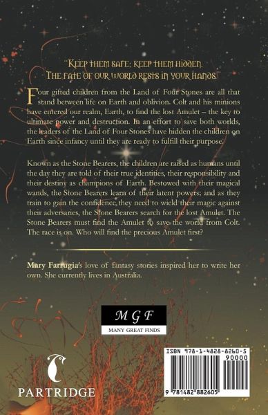Four gifted children from the Land of Four Stones are all that stand between life on Earth and oblivion. Colt and his minions have entered our realm, Earth, to find the lost Amulet - the key to ultimate power and destruction. In an effort to save both worlds, the leaders of the Land of Four Stones have hidden the children on Earth since infancy until they are ready to fulfill their purpose. Known as the Stone Bearers, the children are raised as humans until the day they are told of their true identities, their responsibility and their destiny as champions of Earth. Bestowed with their magical…mehr