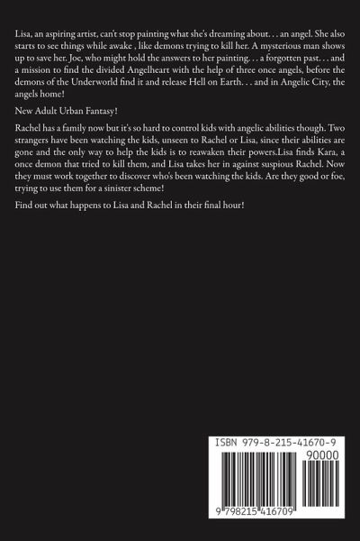 Lisa, an aspiring artist, can't stop painting what she's dreaming about. . . an angel. She also starts to see things while awake, like demons trying to kill her. A mysterious man shows up to save her. Joe, who might hold the answers to her painting. . . a forgotten past. . . and a mission to find the divided Angelheart with the help of three once angels, before the demons of the Underworld find it and release Hell on Earth. . . and in Angelic City, the angels home! New Adult Urban Fantasy! Rachel has a family now but It's so hard to control kids with angelic abilities though. Two strangers have been watching the kids, unseen to Rachel or Lisa, since their abilities are gone and the only way to help the kids is to reawaken their powers.Lisa finds Kara, a once demon that tried to kill them, and Lisa takes her in against suspious Rachel. Now they must work together to discover who's been watching the kids. Are they good or foe, trying to use them for a sinister scheme! Find out what happens to Lisa and Rachel in their final hour!