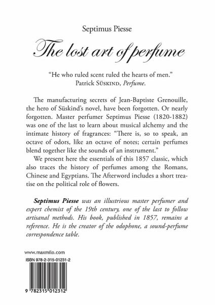 "He who ruled scent ruled the hearts of men."Patrick Süskind, Perfume.The manufacturing secrets of Jean-Baptiste Grenouille, the hero of Süskind's novel, have been forgotten. Or nearly forgotten. Master perfumer Septimus Piesse (1820-1882) was one of the last to learn about musical alchemy and the intimate history of fragrances: "There is, so to speak, an octave of odors, like an octave of notes; certain perfumes blend together like the sounds of an instrument." We present here the essentials of this 1857 classic, which also traces the history of perfumes among the Romans, Chinese and Egyptians. The Afterword includes a short treatise on the political role of flowers.