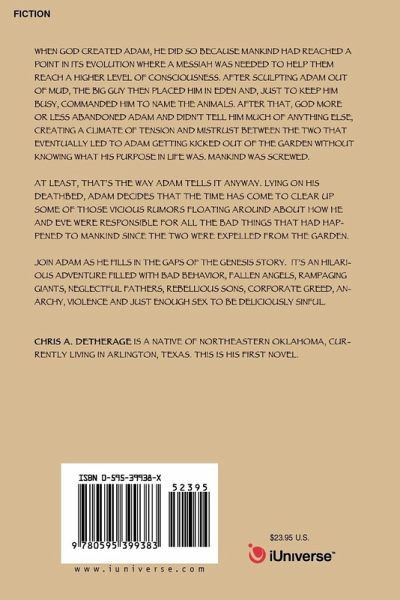 When God created Adam, He did so because mankind had reached a point in its evolution where a messiah was needed to help them reach a higher level of consciousness. After sculpting Adam out of mud, the Big Guy then placed him in Eden and, just to keep him busy, commanded him to name the animals. After that, God more or less abandoned Adam and didn't tell him much of anything else, creating a climate of tension and mistrust between the two that eventually led to Adam getting kicked out of the Garden without knowing what his purpose in life was. Mankind was screwed. At least, that's the way Adam tells it anyway. Lying on his deathbed, Adam decides that the time has come to clear up some of those vicious rumors floating around about how he and Eve were responsible for all the bad things that had happened to mankind since the two were expelled from the Garden. Join Adam as he fills in the gaps of the Genesis story. It's an hilarious adventure filled with bad behavior, fallen angels, rampaging giants, neglectful fathers, rebellious sons, corporate greed, anarchy, violence and just enough sex to be deliciously sinful.