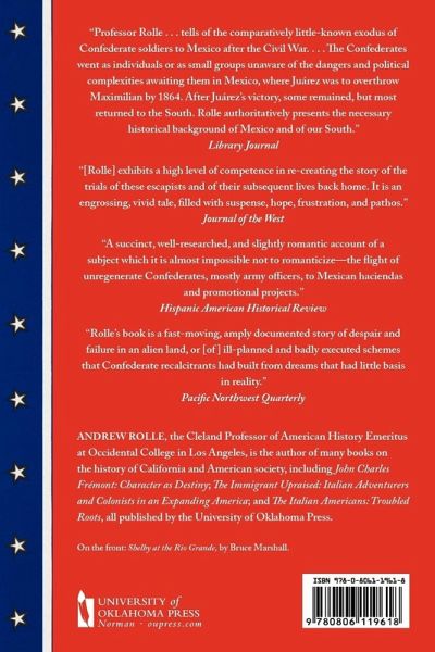 In the midst of the heartbreak, confusion, and rumors that followed Appomattox, some Southerners resolved to emigrate rather than surrender, and emigrate they did-to South America, Europe, Canada, and Mexico. Mexico's Emperor Maximilian, trying to secure his shaky throne against Juarez' opposition, encouraged these recalcitrant Confederates to settle in Mexico. But, doomed to defeat by the internal crisis in Mexico and by the Southerners' failure to face reality, the Confederate colonies were established and destroyed within two years' time. Later, many of the colonists who survived the ordeal tried to forget that they had ever gone into exile. Among the emigrants were many prominent Southern leaders, barred from holding public office and, in some cases, facing possible arrest: General Jo Shelby, the hero of the Confederacy, who later became so reconciled to the victory of the North that he voted for a Republican; Commodore Matthew Maury, internationally recognized oceanographer and naval astronomer, who was welcomed to Mexico by Maximilian himself; Henry Watkins Allen, "the single great administrator produced by the Confederacy," who founded the English language Mexican Times; and Thomas Caute Reynolds, former lieutenant governor of Missouri, who encouraged Maximilian to stay in Mexico but who himself left. In all there may have been between eight and ten thousand Confederates in Mexico. The exodus, exile, and repatriation of the Confederates constitute a hitherto incompletely known incident in American history. In this fully documented account, Andrew F. Rolle reveals the hope, humor, disappointment, and defeat of Americans who believed that the only way to save their way of life was to leave their homeland. Andrew F. Rolle has written four books on various aspects of California history and is the editor of The Road to Virginia City: The Diary of lames Knox Polk Miller (Norman, 1960). He is currently professor of history in Occidental College, Los Angeles