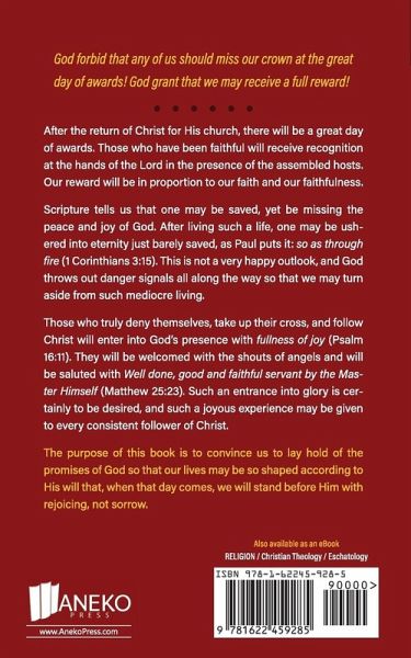 God forbid that any of us should miss our crown at the great day of awards! God grant that we may receive a full reward! After the return of Christ for His church, there will be a great day of awards. Those who have been faithful will receive recognition at the hands of the Lord in the presence of the assembled hosts. Our reward will be in proportion to our faith and our faithfulness. Scripture tells us that one may be saved, yet be missing the peace and joy of God. After living such a life, one may be ushered into eternity just barely saved, as Paul puts it: so as through fire (1 Corinthians 3:15). This is not a very happy outlook, and God throws out danger signals all along the way so that we may turn aside from such mediocre living. Those who truly deny themselves, take up their cross, and follow Christ will enter into God's presence with fullness of joy (Psalm 16:11). They will be welcomed with the shouts of angels and will be saluted with Well done, good and faithful servant by the Master Himself (Matthew 25:23). Such an entrance into glory is certainly to be desired, and such a joyous experience may be given to every consistent follower of Christ. The purpose of this book is to convince us to lay hold of the promises of God so that our lives may be so shaped according to His will that, when that day comes, we will stand before Him with rejoicing, not sorrow.